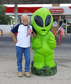 Back over to the main street through town where we managed to find a place to eat. A Mexican restaurant with slow service and just OK food. Nothing special but we were hungry. After lunch, we quickly strolled through the two blocks of festivities for a look. Mostly arts & craft booths with some alien stuff added to the mix. One of the most creative displays was this one guy who turned old tires into alien creatures, plants, and other objects. These were my distant relatives, the Goodyear family, from the planet Yokohama of the Uniroyalverse. On the drive out of town we stopped for gas and had my picture taken with a very patriotic visitor.